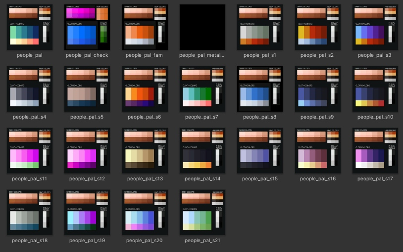 The characters UV have been mapped in a way to make easy the switching of palettes. These textures (acting as palettes) have a standardized structure with areas corresponding to different surfaces of the characters: